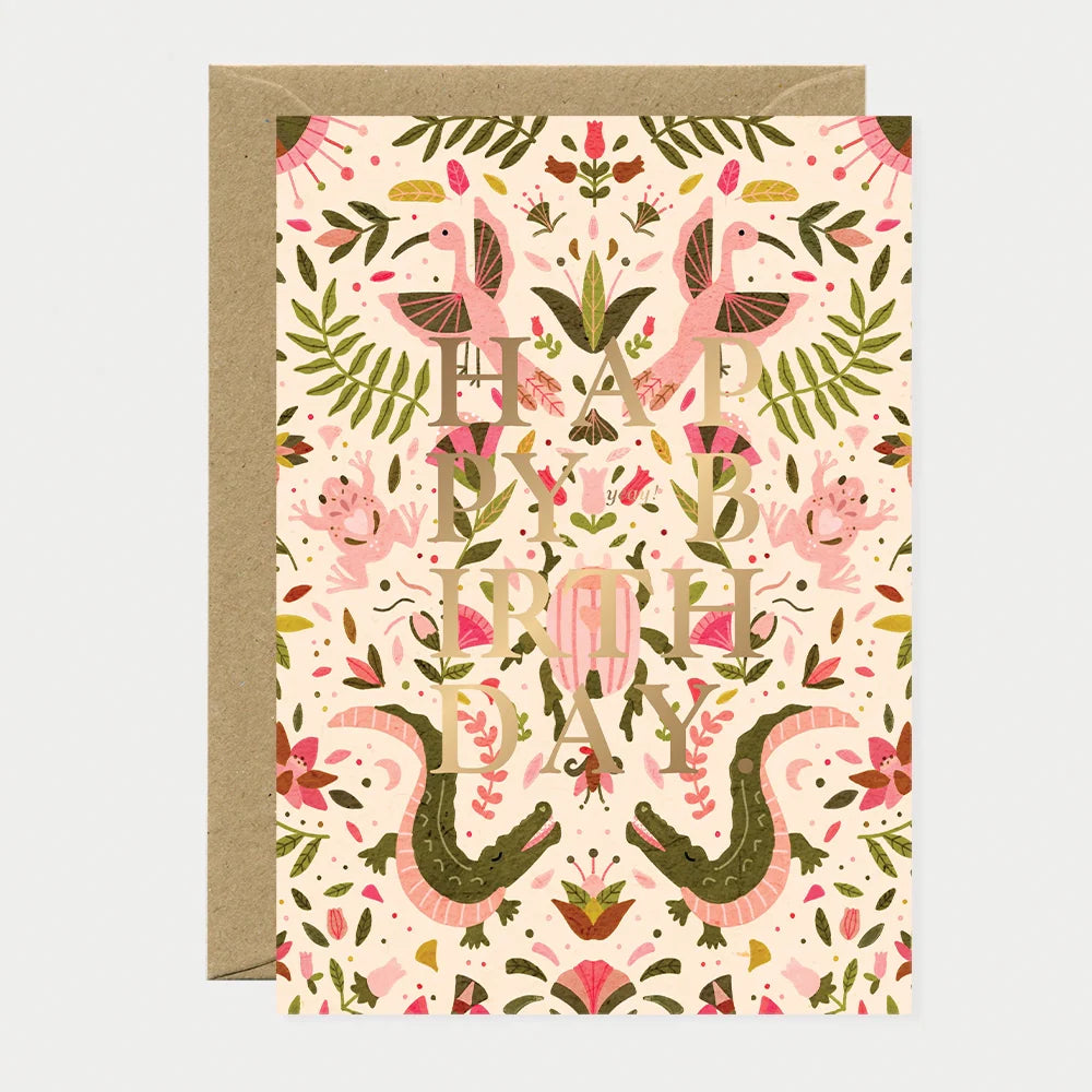 Make a splash on their special day with the Happy birthday pink croco — Greeting card by All The Ways To Say. Featuring a vibrant, symmetrical folk-art pattern of pink crocodiles, tropical birds, and playful frogs, this card is crowned with elegant gold "HAPPY BIRTHDAY" lettering. It is the perfect choice for those who love original designs and a touch of jungle magic.