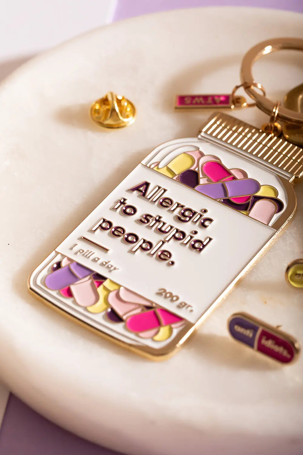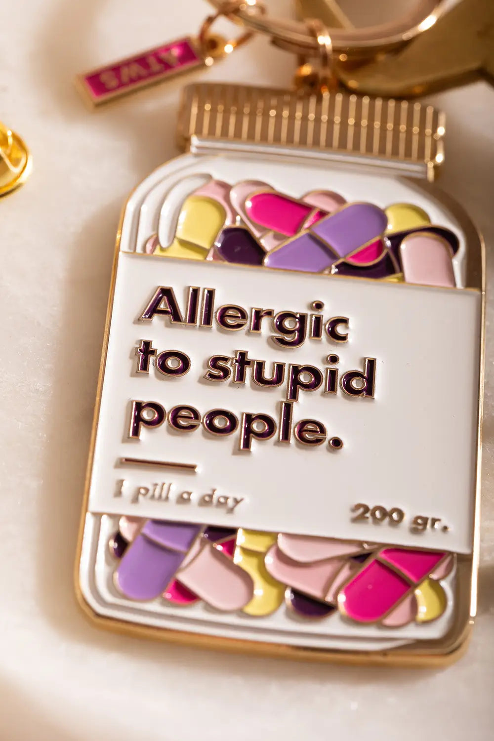 Sometimes, the only cure is a bit of wit. The Allergic to - Keychain by All The Ways To Say brings a humorous touch to your everyday essentials. Featuring a vibrant watercolor-style pill jar filled with "anti-idiot" capsules and the bold message "Allergic to stupid people.", this accessory is both a statement and a survival tool. Crafted with a sleek gold enamel finish, it adds a shining touch of sass to your keys or handbag.