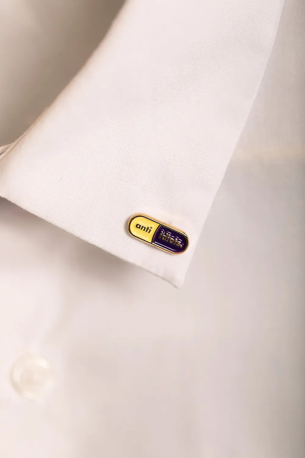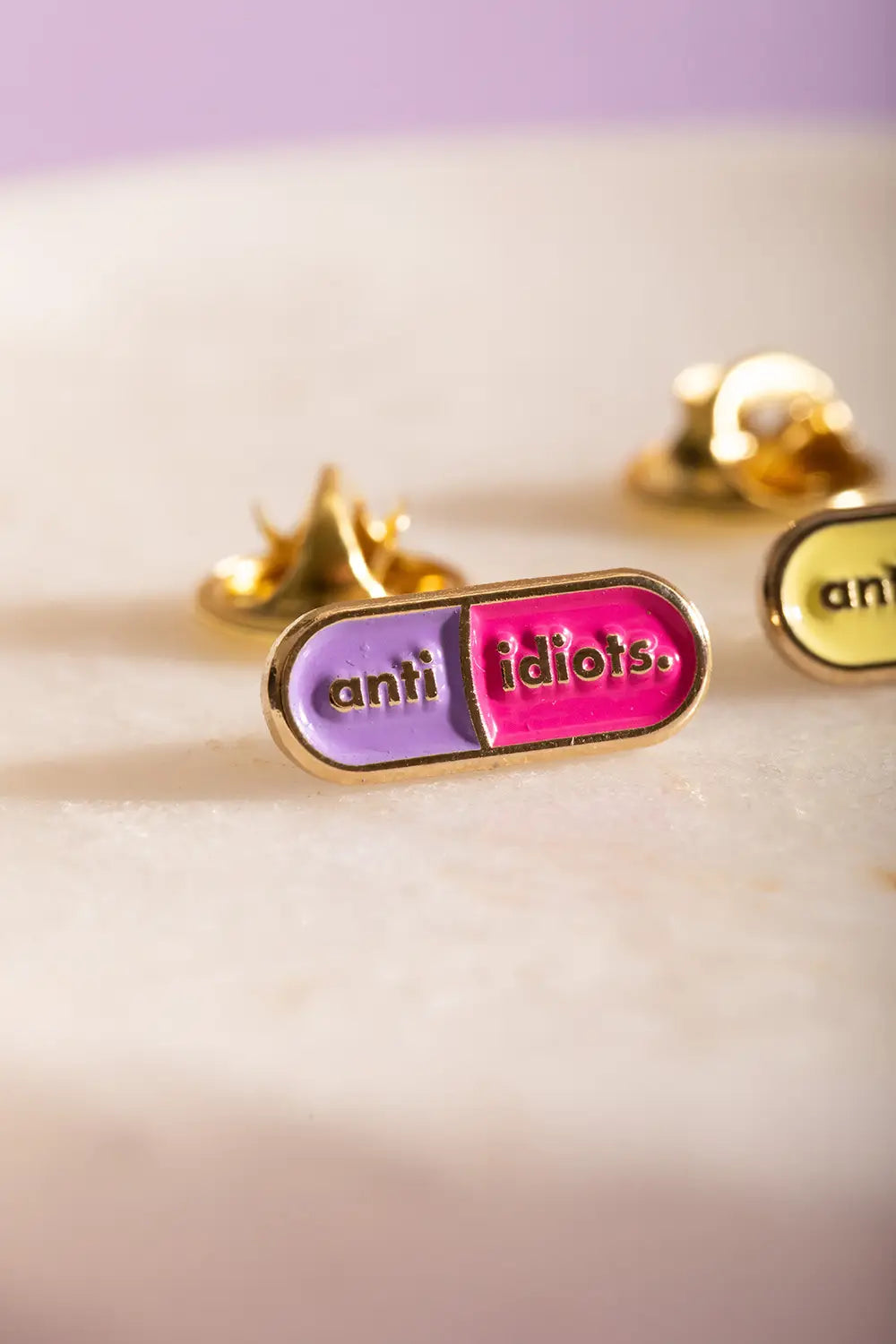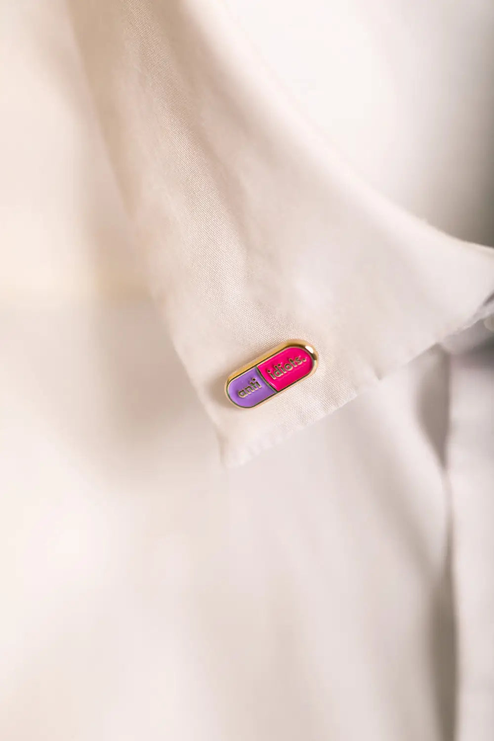 Sometimes, a little irony is the best medicine. The Anti Idiots Duo — Enamel Pin by All The Ways To Say features two separate capsule-shaped pins with a sleek gold finish and the witty "anti idiots" message. Presented on a charming watercolor backing card of a pill jar labeled "Allergic to stupid people," this duo is perfect for pinning to your lapel, collar, or bag as a silent but sparkling statement.