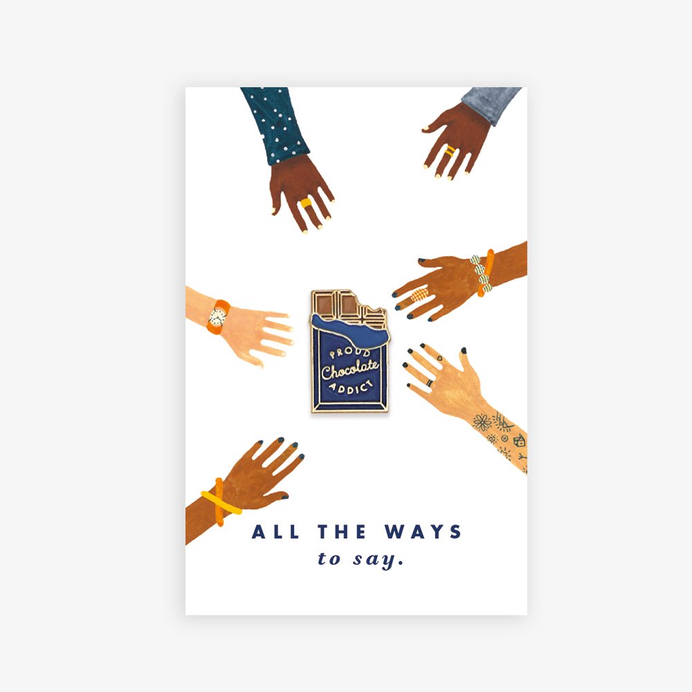 The Chocolate Addict – Pin by All the Ways to Say is a love letter to every cocoa lover out there. Crafted with high-quality enamel and gold-plated details, this playful pin proudly declares your sweet addiction. Perfect to pin on your denim jacket, tote bag, or backpack, it’s a delicious reminder that life is better when there’s chocolate involved.