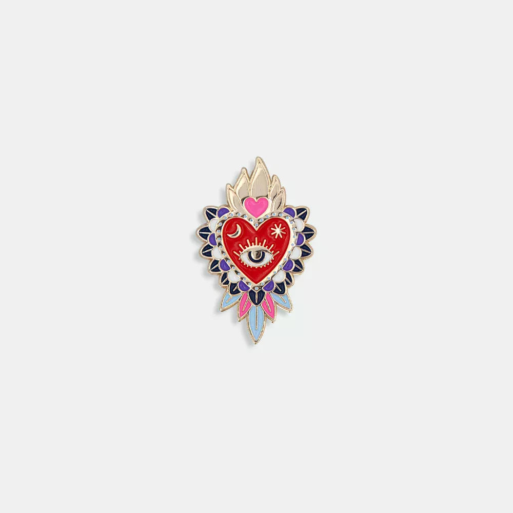 The Ex-Voto – Pin by All the Ways to Say blends sacred charm and modern flair. Inspired by iconic flaming hearts, this colorful enamel pin features a watchful eye surrounded by delicate gold details — a poetic mix of beauty and meaning. Wear it as a tiny talisman or a bold fashion statement that radiates good vibes.