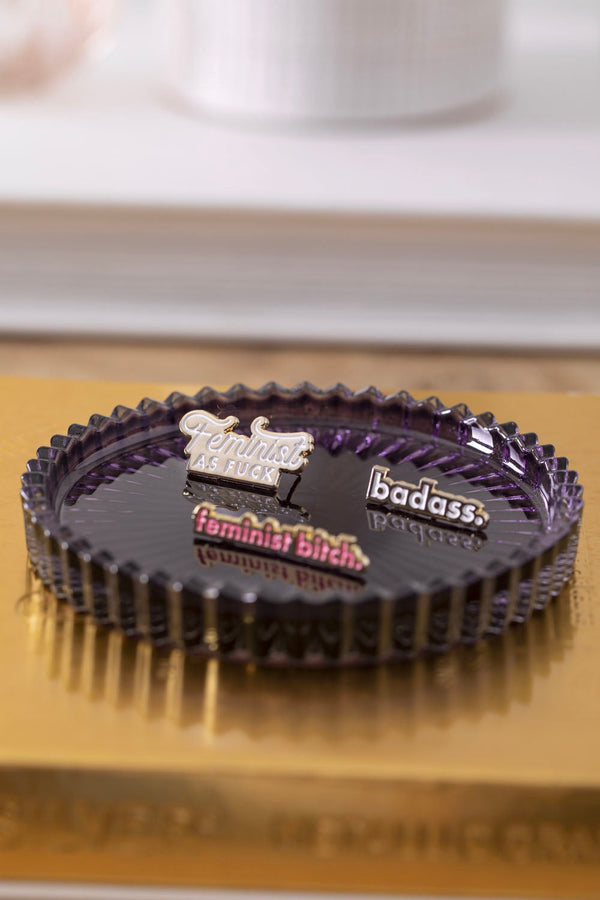 The Feminist Pin Set by All the Ways to Say includes 3 XL enamel retro pins: “Badass,” “Feminist as Fuck,” and “Feminist Bitch.” Each pin is finished with refined gold plating, combining rebellious spirit and chic design. Perfect for customizing jackets, tote bags, or accessories with a powerful feminist twist.