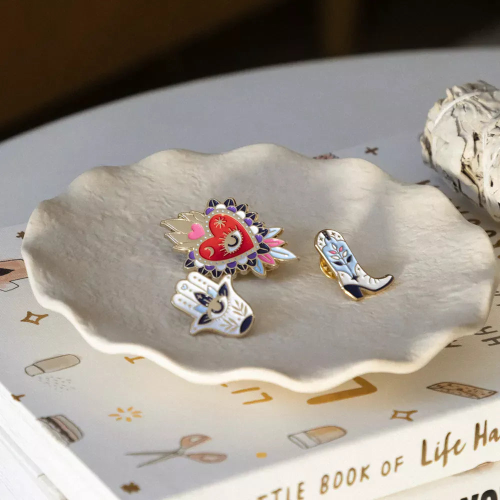 The Santiag Pin by All the Ways to Say is a retro enamel accessory with refined gold plating, shaped like a classic cowboy boot with delicate details. Both bold and chic, it’s perfect for adding a touch of adventure and originality to your outfits, bags, or accessories.