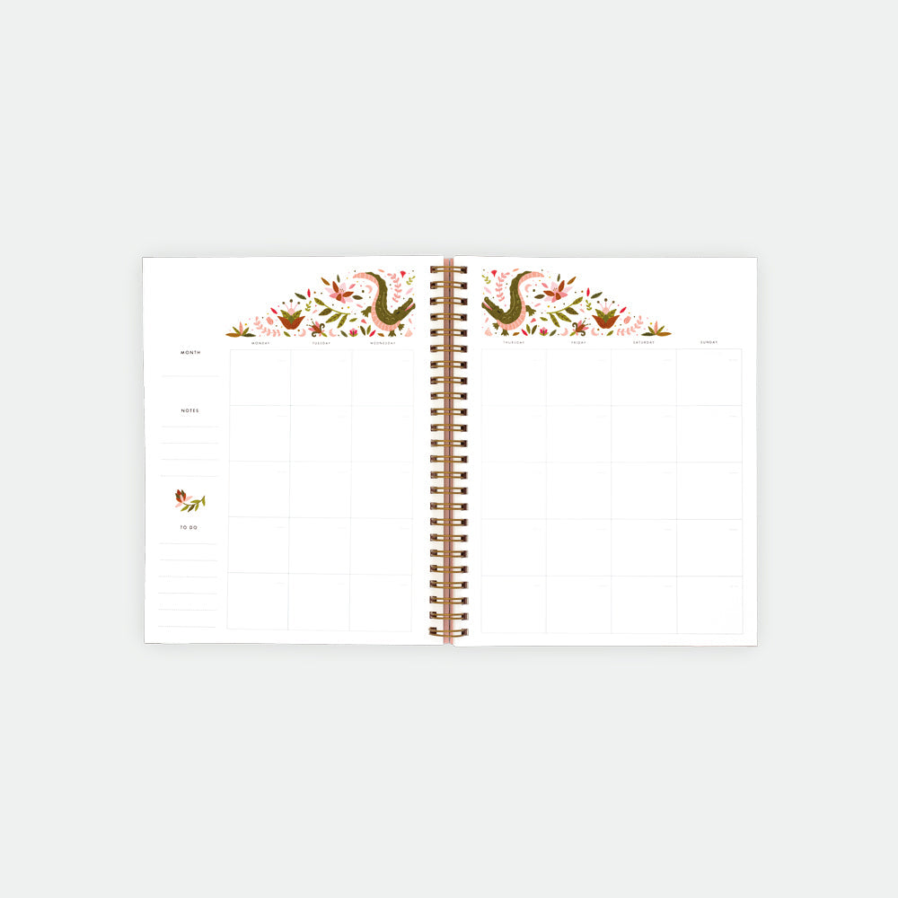 The Pink Croco Monthly Planner Spirals by All the Ways to Say combines fashion and functionality in a unique design. Its faux crocodile-skin texture in soft pink, highlighted by a cover with gold foil details, adds an elegant and trendy flair to your planning routine. With its spiral binding, it is easy to use and carry everywhere, making it the perfect companion for stylish organization.