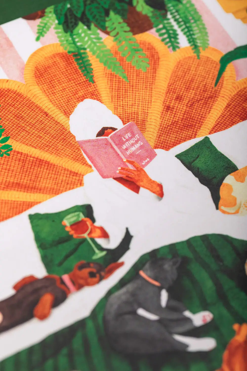 The The Art of Not Going Out Hardcover Notebook A5 by All the Ways to Say celebrates the quiet joy of a night in. Its deep forest green cover features a lush, hand-painted illustration of a homebody's sanctuary—complete with a glass of wine, a good book, and a loyal pack of pets. Shimmering gold foil accents and a matching green ribbon bookmark add a refined finish to the sturdy hardcover. Inside, 220 lined pages of premium paper provide a refreshing set for your daily reflections, creative sketches, or cozy planning.